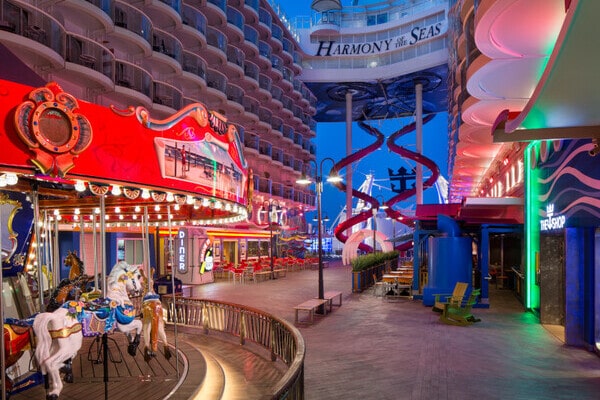 Por otro lado está el Boardwalk, también un espacio abierto al aire libre , lleno de vida. Allí encontrarás un tiovivo tallado a mano en el que podrás subir de forma gratuita, tengas la edad que tengas. Además, podrás cenar en el Johny Rockets, uno de los restaurantes más famosos y peculiares de los barcos de Royal Caribbean; o en el Dog House donde se sirven los mejores perritos calientes. Estos son solo algunos de los establecimientos que encontrarás en el Boardwalk; pero sin duda, lo más impresionante es el Aquatheater, un teatro acuático en el que verás los mejores espectáculos de acrobacia desde varios metros de altura.